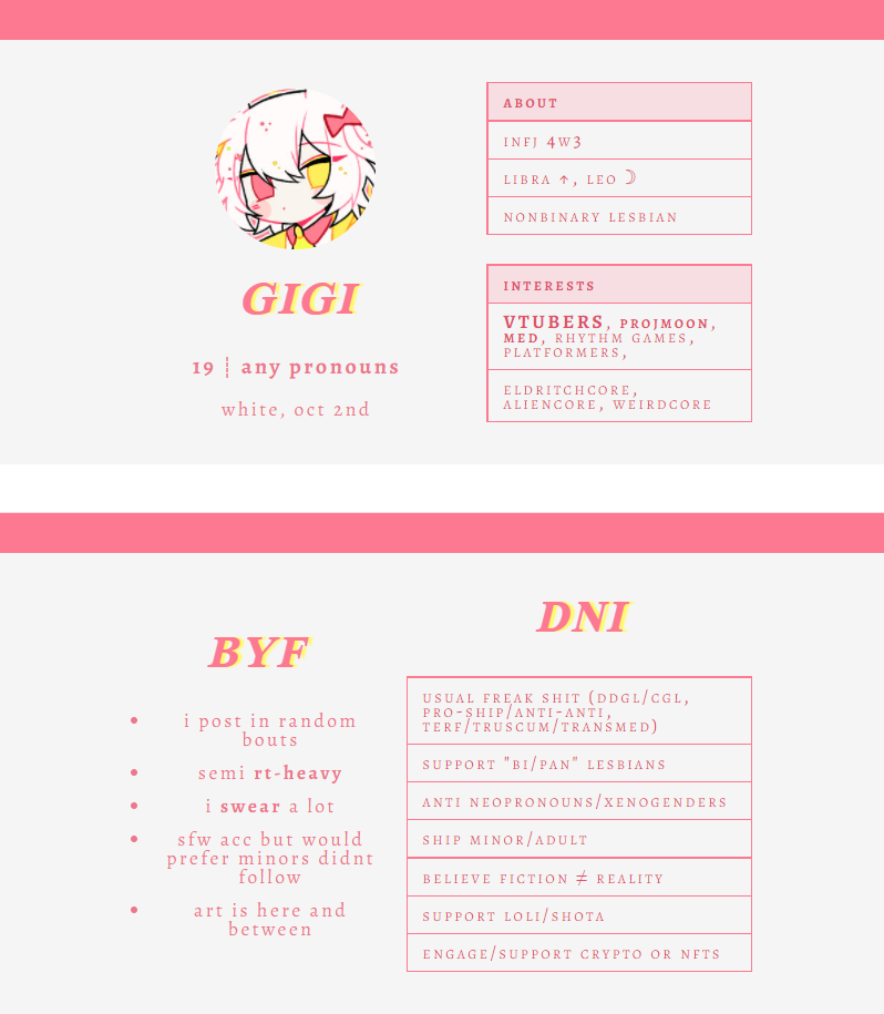 i post in random boutssemi rt-heavyi swear a lotsfw acc but would prefer minors didnt followart is here and between